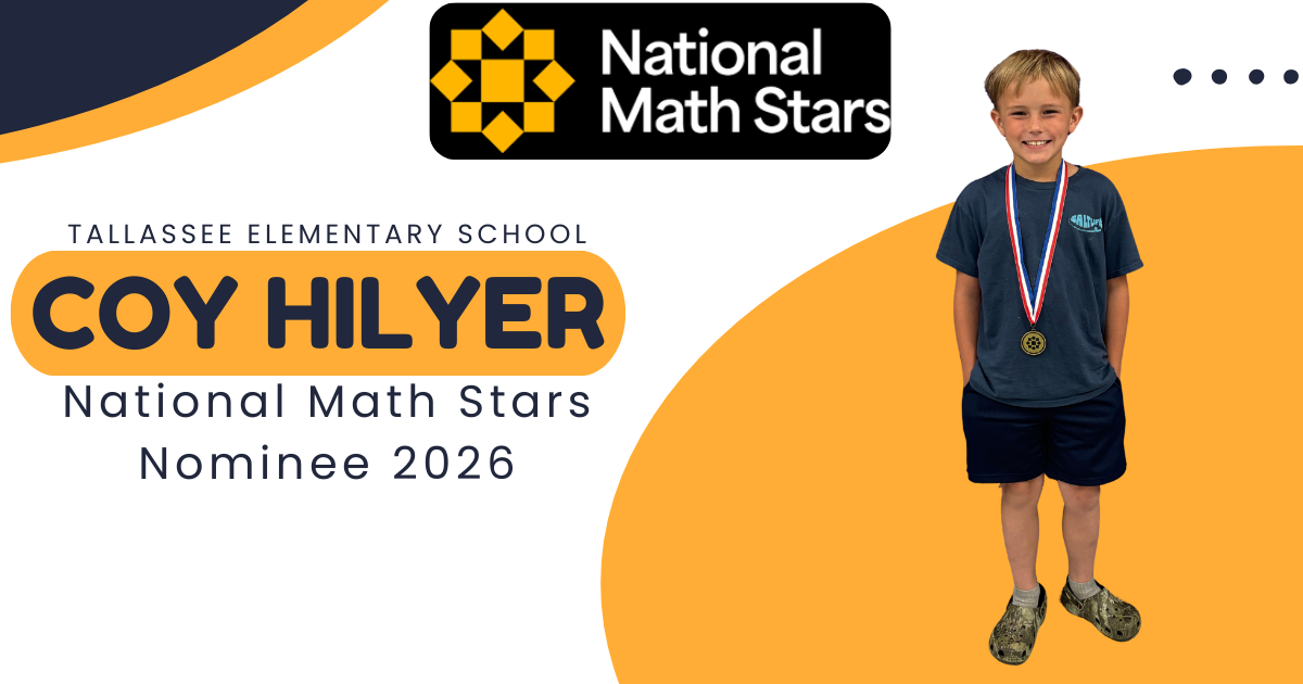 Exciting news from Tallassee Elementary School! We’re proud to announce that Coy Hilyer has been nominated as a National Math Star! Nomination is reserved for students scoring in the top 2% on the ...